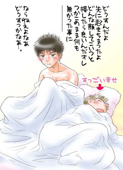 阿部誕記念に描いた。 阿部君の誕生日なのに、三橋が幸せでどうするか。 良いか。三橋の幸せは阿部君の幸せだもんな。っと。 なんかなー。でもコレだと、どっちかつうと明日の朝? 三橋がプレゼントとして。この場合最大の問題は多分 貰った のか 押付けられた のか 奪われた のか。 なんにしてもろくなもんじゃない。すいません。本当に。 ←戻る→